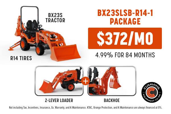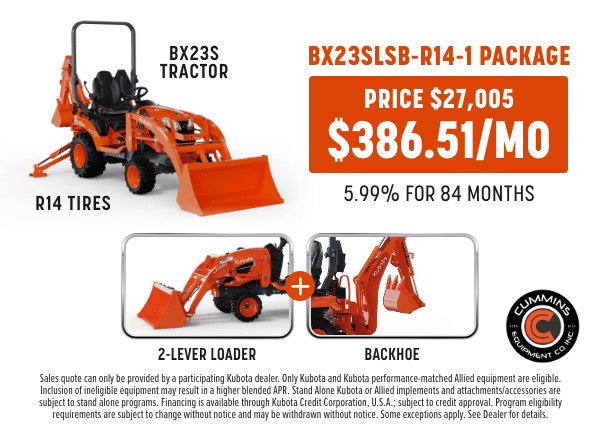 Sales quote can only be provided by a participating Kubota dealer. Only Kubota and Kubota performance-matched Allied equipment are eligible. Inclusion of ineligible equipment may result in a higher blended APR. Stand Alone Kubota or Allied implements and attachments/accessories are subject to stand alone programs. Financing is available through Kubota Credit Corporation, U.S.A.; subject to credit approval. Program eligibility requirements are subject to change without notice